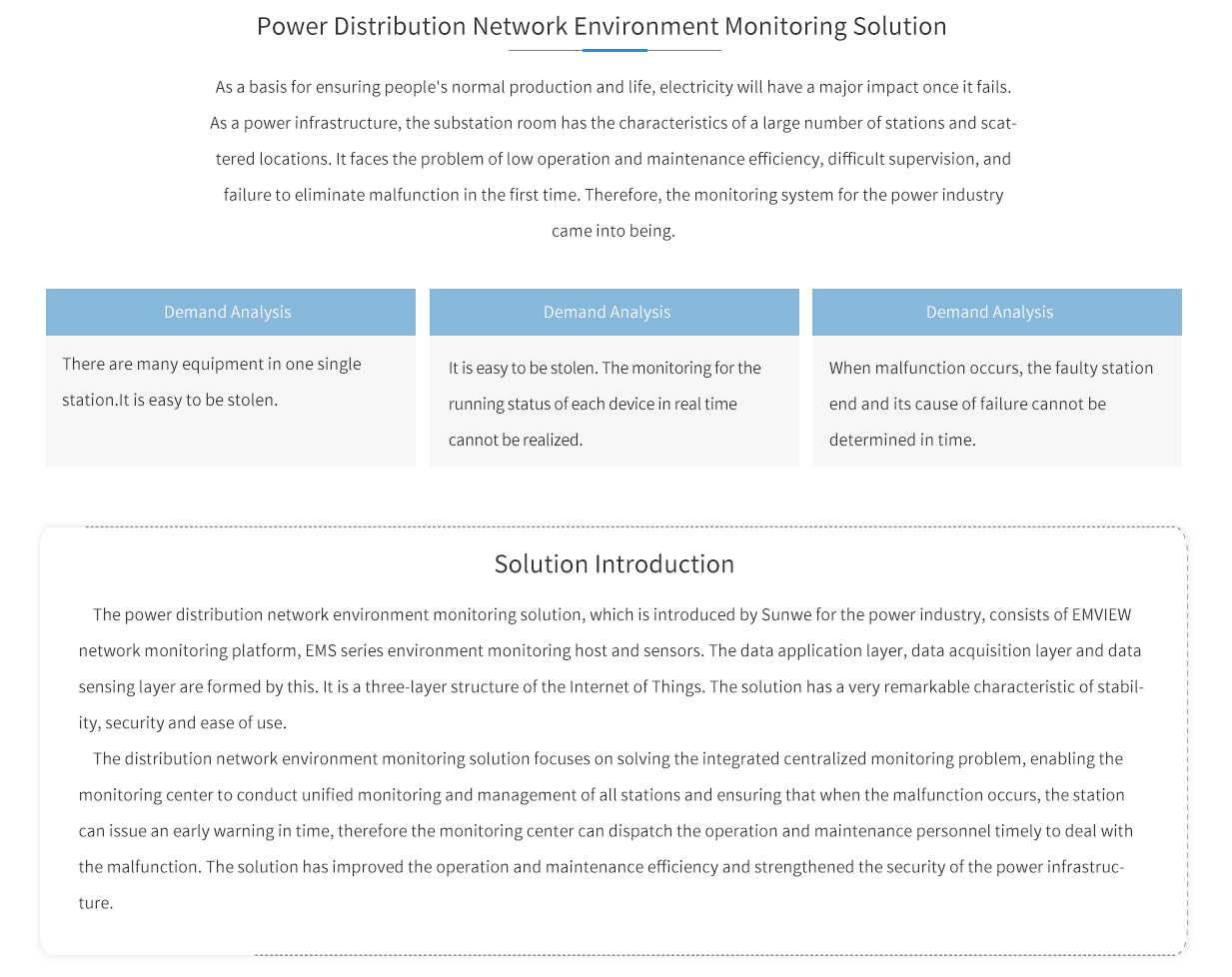 The distribution network environment monitoring solution focuses on solving the integrated centralized monitoring problem, enabling the monitoring center to conduct unified monitoring and management of all stations and ensuring that when the malfunction occurs, the station can issue an early warning in time, therefore the monitoring center can dispatch the operation and maintenance personnel timely to deal with the malfunction. The solution has improved the operation and maintenance efficiency and strengthened the security of the power infrastructure.